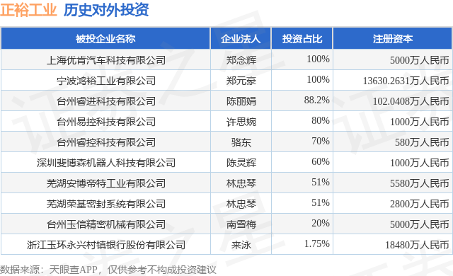 本站消息真牛所,根据天眼查APP显示,正裕工业(603089.SH)新增一起对外投资事件,被投资公司为深圳斐博森机器人科技有限公司,法定代表人陈灵辉,投资占比为60%。该公司从事计算机、通信和其他电子设备制造业,注册资本为1000万人民币。目前,正裕工业共存在对外投资10项,详见下表: