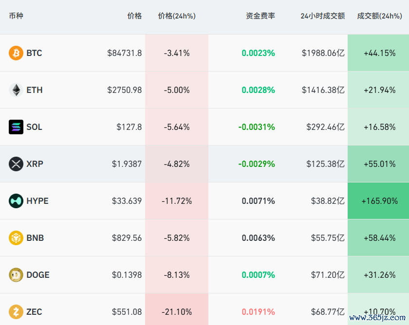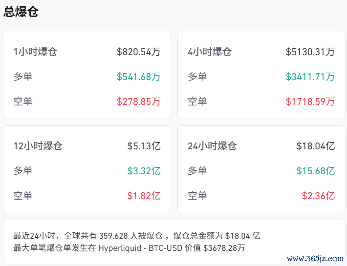 加密货币普遍大跌,成交额飙升。截至北京时间11月22日6:30左右,过去24小时内比特币跌超3.4%,成交额大增44%;HYPE跌近5%,成交额暴增166%。市场近36万人被爆仓,爆仓总金额达18.04亿美元。