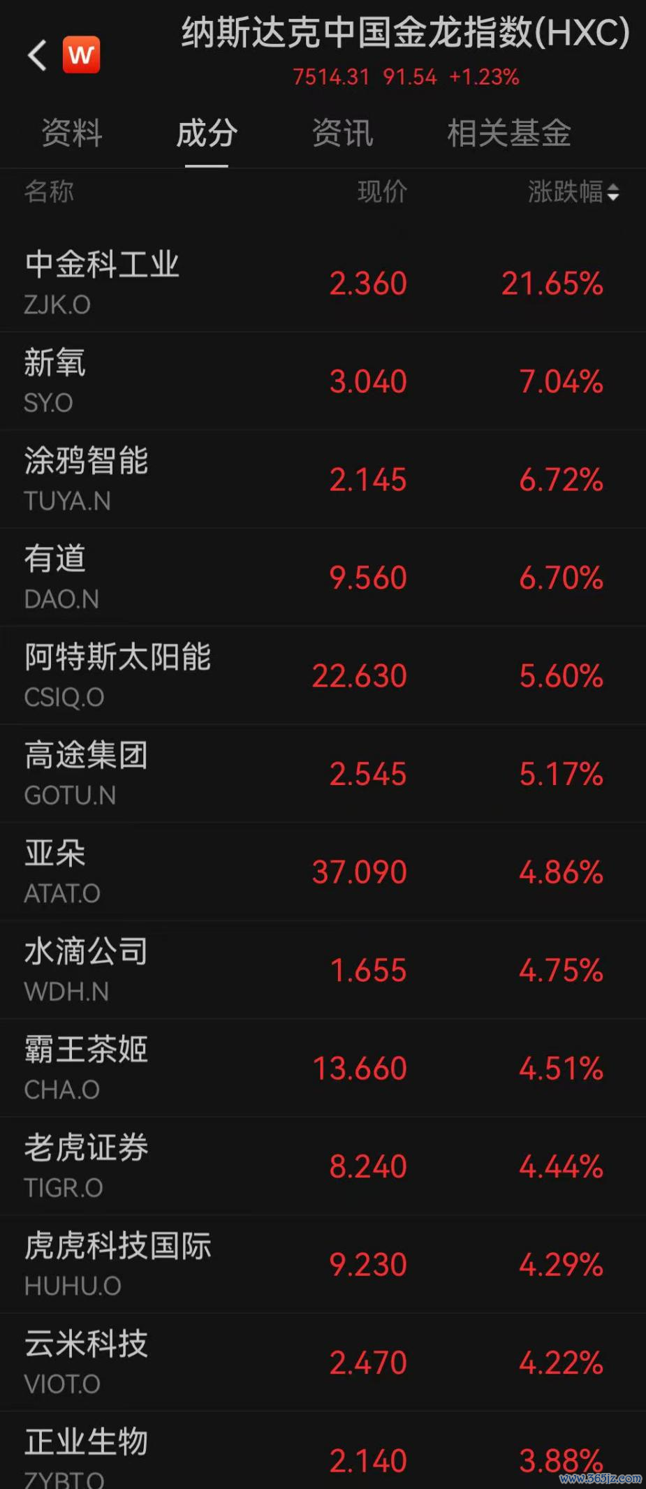 热门中概股多数上涨,纳斯达克中国金龙指数上涨1.23%,中金科工业涨逾21%,新氧涨逾7%,涂鸦智能、有道涨逾6%,阿特斯太阳能、高途集团涨逾5%,亚朵、水滴公司、霸王茶姬、老虎证券等涨逾4%,小牛电动、蔚来等涨逾3%,贝壳、禾赛科技、腾讯音乐、哔哩哔哩、理想汽车等涨逾2%,京东集团、小鹏汽车、微博等涨逾1%,阿里巴巴、金山云、极氪等小幅下跌。