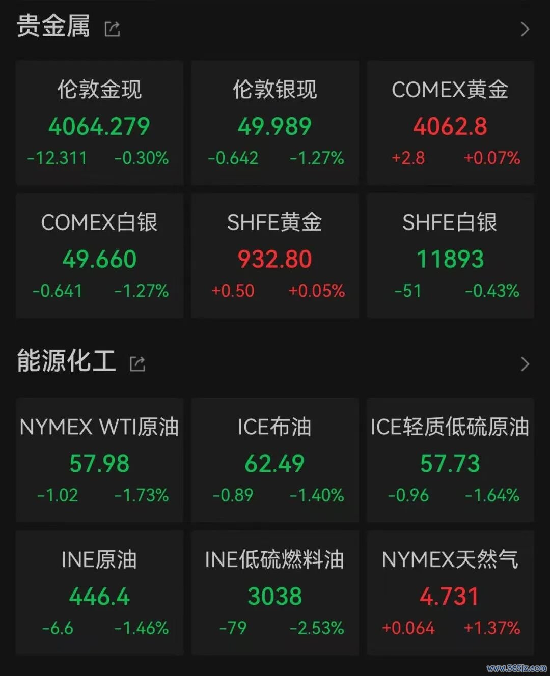 商品市场方面,当地时间11月21日,截至收盘,伦敦现货黄金下跌0.30%,报4064.279美元/盎司;COMEX黄金期货上涨0.07%,报4062.8美元/盎司。伦敦现货白银下跌1.27%,COMEX白银期货下跌1.27%。