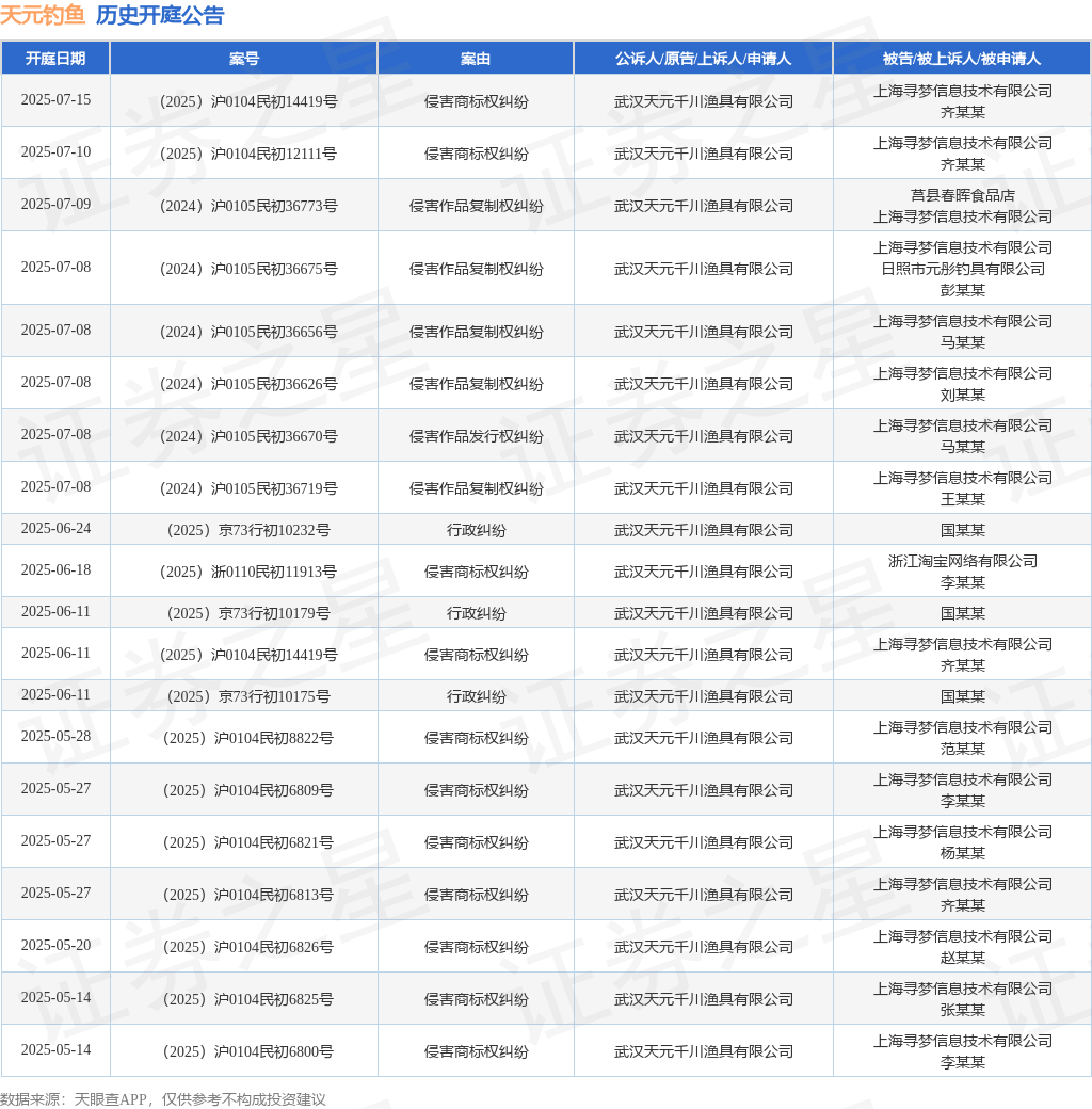 案号:(2025)浙0110民初11913号审理法院:杭州市余杭区人民法院案由:侵害商标权纠纷当事人信息: 原告/上诉人:武汉天元千川渔具有限公司 被告/被上诉人:浙江淘宝网络有限公司、李某某开庭日期:2025年6月18日根据统计,近一年内以武汉天元千川渔具有限公司为当事人的历史开庭公告有127则,其中案由为“侵害商标权纠纷”的公告以97则居首,其次为“侵害作品复制权纠纷”有16则,“侵害作品发行权纠纷”有5则。历史开庭公告(前20条)如下: